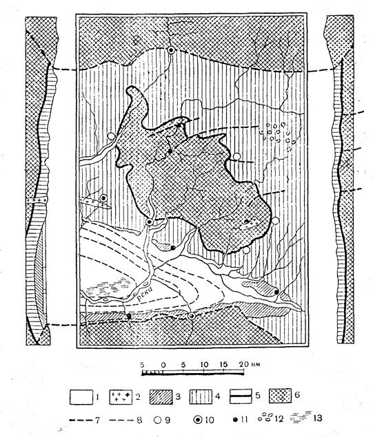 разрезами (по А.М. Овчинникову): 1 – аллювиальные отложения с неглубоко залегающими грунтовыми водами; 2 – молодые эффузивные породы, создающие преграды для подземных вод; 3 – третичные гипсоносные песчаники, слабоводообильные, с отдельными пластово-трещинными водоносными горизонтами; 4 – сильно водообильные верхнеюрские известняки с пластово-трещинно-карстовыми водами; 5 – титонская водоупорная глинистая толща; 6 – компактные нижнеюрские туфогенно-песчанистые толщи с местными грунтовыми трещинными водами в коре выветривания и в зонах тктонических разрывов; 7 – тектонические разрывы; 8 – изолинии кровли наиболее водообильной верхнеюрской известняковой толщи в синклинали, образующие напорный бассейн; 9 – пресные источники с дебитом более 1 л/сек; 10 – минеральные источники с дебитом менее 1 л/сек, со свободно выделяющимися газами; 11 – минеральные источники с дебитом менее 1 л/сек, не выделяющие свободных газов; 12 – карстовые воронки; 13 – заболоченность