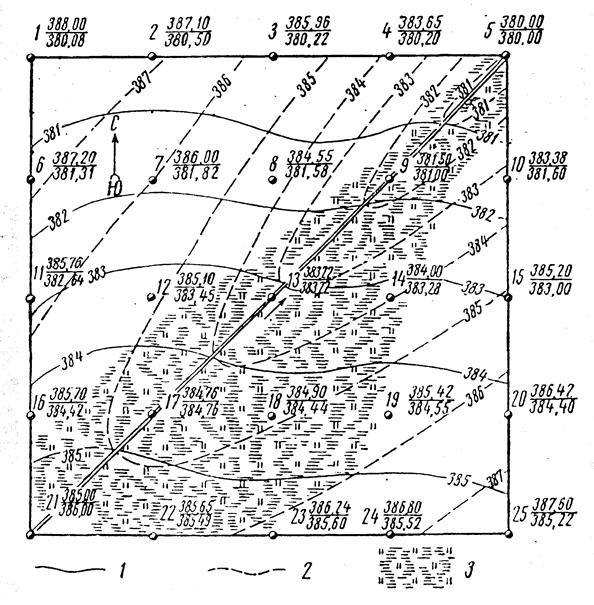 Рис. 26. Карта гидроизогипс и горизонталей земной поверхности: 1 – горизонтали; 2 – гидроизогипсы; 3 – заболоченность