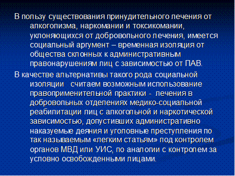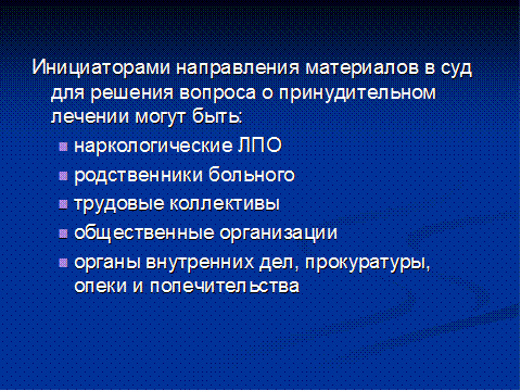- специализированными лечебно-профилактическими учреждениями, осуществляющими принудительное лечение лиц, страдающих алкоголизмом и наркозависимостью;