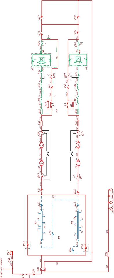 Вторая ветвь: контакт контактора К34, провод 058, контакты 11-9 режимного переключателя QP2, провод 054, контакт быстродействующего контактора К42, провод 052, реактор L3 шунтированный резистором R14, провод 042, шунт RS2, провод 040, контакты 9-8 реверсора QP1, провод 038, якорь тягового двигателя М4, провод 036, якорь тягового двигателя М3, провод 034, контакты 11-10 реверсора QP1, провод 030, контакт контактора К28.