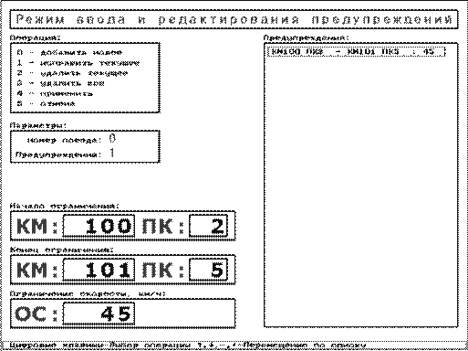 Для ввода временных ограничений по скоростям для режима автоведения необходимо нажать клавишу 4. Вид окна ввода временных ограничений представлен на рисунке 5.