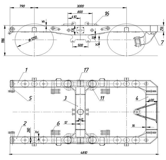 Верхний и боковые листы боковины рамы тележки выполнены плоскими, а нижний в центральной части имеет прогиб радиусом 350 мм. Для стыковки с концевой балкой нижний и верхний листы имеют закругление радиусом 400мм и выступ шириной 400мм. Для стыковки со средней балкой закругления радиусом 250 мм и выступ шириной 340мм.