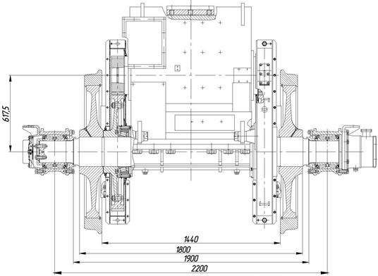 Колесно-моторный блок включает в себя колесную пару, кожух зубчатой передачи, шестерни и тяговый двигатель типа ЭДП810 с опорно-осевым подвешиванием через моторно-осевые подшипники качения. Основные размеры представлены на рисунке 2.4.