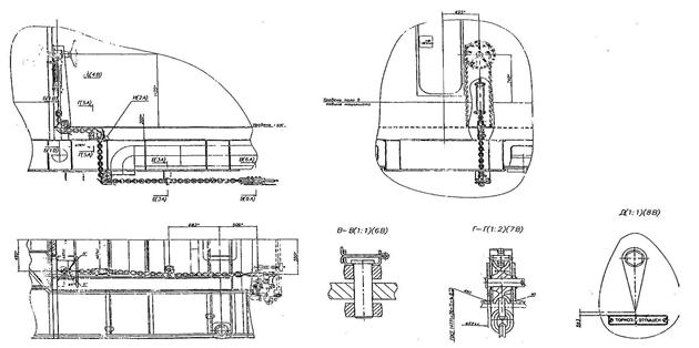 Ручной тормоз состоит из привода и поддерживаемой роликами круглозвенной цепи, соединенной с одной стороны с гайкой винтовой передачи привода, а с другой – с поперечной балкой рычажной передачи тормоза.