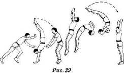 Докручивая сальто, ученик отнимает руки от груди и приходит на пол с поднятыми вверх руками (рис. 29).