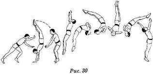 Исполнение. Ученик делает отход, как при исполнении сальто планш. В тот момент, когда он раскрывает грудь и отклоняет голову назад, резким движением рук и плеч он поворачивает корпус на 180° справа налево. Исполнив сальто, ученик приходит на пол с поднятыми вверх руками (рис. 30).