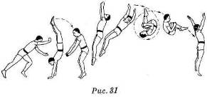 движением рук и плеч поворачивает корпус на 180° справа налево и, повернувшись, группируется, подтягивая грудь и голову к коленям. Выкручивая переднее сальто, разгруппировываясь и выпрямляя корпус, ученик приходит на пол (рис. 31).