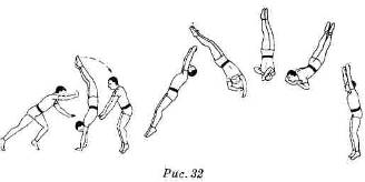 вверх он обеспечивает переворот своего корпуса назад и затем делает поворот справа налево на 360° (т. е. полный пируэт) при помощи резкого рывка руками и одновременного резкого поворота плечами справа налево. Причем руки при взлете поднимаются вверх, а в момент вращения корпуса вокруг своей оси справа налево прижимаются к груди, согнутые в локтях. Докручивая сальто, отнимая руки от груди, ученик с прямым корпусом приходит на ноги (рис. 32).