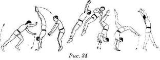 Исполнение. Сделав рондад, прыгун отталкивается от пола, слегка отклоняя корпус назад, прикладывает руки к груди, отклоняя голову назад. При взлете вверх прыгун делает поворот справа налево на 180° и, выходя в вертикальное положение вниз головой, отнимает руки от груди, ставит прямые руки на пол так, как они ставятся при исполнении арабского колеса в длину, только одновременно. По инерции, полученной от взлета вверх назад, прогибаясь в пояснице, он делает перекрученное колесо и приходит сначала на правую, затем на левую ногу, которой тотчас же отталкивается для следующего рондада и последующего за ним арабского колеса (рис. 34).