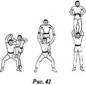 на левое плечо нижнего и, отпуска его руки, выпрямляется. Вход на плечи должен облегчаться выпрямлением рук нижнего сбоку слева наверх над головой и упором рук верхнего на руки нижнего. С разъединением рук по входе верхнего на плечи нижний держит голову прямо, сохраняя передний упор для ног верхнего, согнутыми в локтях руками обхватывает икры ног верхнего. Локти нижнего должны быть развернуты в стороны. Верхний стоит на плечах нижнего на носках с опущенными вниз и соединенными вместе пятками, держа ноги слегка согнутыми в коленях, корпус и голову держит прямо (рис. 41).