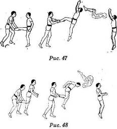 Нижний в момент прыжка верхнего выпрямляется, поднимает верхнего за ногу и подкручивает его, облегчая выполнение переднего сальто, затем выпускает его ногу из своих рук. Верхний приходит на пол (рис. 48).