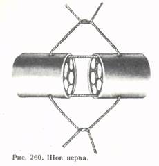 Различают первичный, ранний отсроченный и вторичный шов нерва. Кроме того, шов нерва может быть эниневраль-ным либо нериневрально-интерфасцику-лярным. Последний чаше применяют при пластике нервов, когда в дефект между концами поврежденного нерва вшивают свободные трансплантаты из отрезков нерва больного (рис. 260).