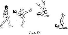 Исполнение. Идя вперед, ученик с ходу делает взмах правой ногой снизу вверх, одновременно отталкиваясь левой ногой от пола, присоединяет ее к правой, теряет точку опоры и падает назад. Взлетая вверх и падая, ученик рассчитывает свои движения так, чтобы прийти на пол не на спину, а на лопатки, причем при взлете он бросает руки вверх, а приземляясь, опускает их вниз и приходит сначала на ладони прямых рук (чем смягчает падение), а затем на лопатки с поднятыми вверх ногами. Голова в момент прыжка и падения не откидывается назад (рис. 57).