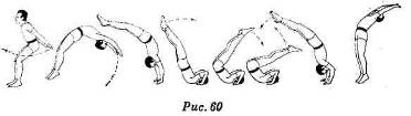 одновременно прогибается в пояснице и, выпрямляя ноги, отталкивается ими от пола. Приземляясь на руки, ученик сгибает их в локтях (смягчая свой приход на пол), подгибает голову на грудь и приходит лопатками на пол. Коснувшись лопатками пола, он делает взмах прямыми ногами снизу вверх, одновременно вновь прогибаясь в пояснице (делая разгиб) и, оттолкнувшись руками от пола (выпрямляя их), приходит ногами на пол (рис. 60).