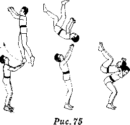 Исполнение. Верхний, взлетая вверх над головой нижнего, делает взмах левой ногой снизу вверх и отклоняет корпус назад. Нижний бросает верхнего вверх над собой, наклоняет корпус, держа спину с небольшим прогибом. Отрывая правую ногу от рук нижнего, верхний присоединяет ее к левой и падает на лопатки. Нижний принимает падающего спиной верхнего к себе на лопатки, смягчая его падение небольшим приседанием. Руки партнеров во время взлета и приземления разведены в стороны. В момент прихода верхнего на спину нижнего оба придерживаются друг за друга кистями рук. После фиксирования прихода спина в спину нижний полностью выпрямляет корпус, и верхний, опуская ноги, встает на пол (рис. 75).