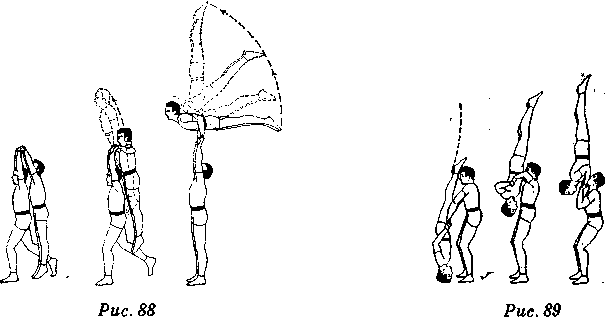 Исполнение. Нижний делает глубокое приседание, тотчас же выпрямляет ноги, сохраняя прямое положение корпуса, и руками резко подтягивает верхнего вверх к себе на грудь. Затем нижний вновь делает приседание и подрывом кистями своих рук (переводя кисти в горизонтальное положение, что облегчает верхнему выход в стойку) вырывает верхнего в стойку кисти в кисти. После чего нижний выпрямляет ноги, толчком или жимом поднимает верхнего вверх на прямые руки и держит его под балансом в стойке (рис. 89).