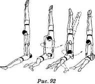 Исполнение. Нижний, опуская левую руку, удерживая верхнего в стойке, заносит ее в левую сторону и ставит локтем на пол на уровне своего левого плеча, затем сгибает правую ногу и, опираясь ею и левым локтем о пол, поворачивается сначала на 90° справа налево. Верхний при опускании левой руки нижнего равномерно распределяет свой вес на обе руки; когда нижний поставил левую руку локтем на пол, верхний переводит свой вес в стойке на свою левую руку. В этот момент нижний заносит левую ногу через правую слева направо, поворачивается еще на 90° справа налево, ставит правую руку локтем на пол на уровне правого плеча и ложится на живот, держа локти перед собой по ширине плеч. Когда нижний поставил правый локоть на пол, верхний вновь распределяет свой вес равномерно на обе руки. Зафиксировав стойку в кистях в этом положении, верхний переводит свой вес на правую руку. Нижний отрывает локоть левой руки от пола и, опираясь носком левой ноги и локтем правой руки о пол, заносит левую руку справа налево, поворачивается на 180° и ложится на спину, перенося левую ногу через правую и ставя левую руку локтем на пол около корпуса. Верхний, когда нижний поставил левую руку на пол, переносит свой вес на левую руку, облегчая этим нижнему перенести правую руку к корпусу, после чего равномерно распределяет свой вес на обе руки, и нижний отжимает его в стойке на прямые руки (рис. 92).