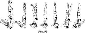 правую руку кладет на правое бедро (кисть руки также должна лежать на бедре ладонью вверх). Верхний переставляет свою правую руку с лопатки нижнего в кисть его правой руки и фиксирует стойку. Нижний поворачивается на левое плечо и ставит левую руку локтем на пол. Одновременно с этим движением нижнего верхний переносит свой вес на левую руку. Оттолкнувшись ногами от пола, согнув их, нижний делает кувырок вперед через левое плечо и, пронеся ноги между руками верхнего, ложится на спину, выпрямляет корпус и отжимает верхнего в стойке вверх на прямые руки. Этим заканчивается первая часть упражнения (рис. 93).