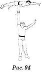 Исполнение. Верхний, стоя на плечах нижнего, опирается на его прямые поднятые вверх руки, взявшись за кисти (захватом для стойки в кистях). Затем верхний снимает правую ногу с плеча нижнего и переставляет левую ногу на его правое плечо. Занося правую вытянутую ногу вправо, верхний ложится корпусом (животом) на локоть согнутой правой руки, перенося на нее весь свой вес, затем снимает левую ногу с плеча нижнего, наклоняет корпус вперед ж поднимает ноги до горизонтального положения, удерживая при этом равновесие и придерживаясь левой рукой за левую руку нижнего. Нижний в момент перехода верхнего корпусом на локоть подводит свою прямую правую руку в центр (по отношению к двух рукам), перенося этим на нее весь вес верхнего. Крепко держа кисть правой руки верхнего (не опуская ее), почувствовав баланс, нижний в этом положении опускает левую руку от левой руки верхнего и держит его на одной правой руке (рис. 94).