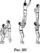 Исполнение. Из исходного положения (см. главу III, упражнение «Прыжки с одной ноги с броска партнера (с фуса)») верхний ставит ступню правой ноги на ладонь правой руки нижнего, отталкивается левой ногой от пола, выпрямляется на правой и делает на ней поворот на 180° справа налево, перенося в этом же направлении свою левую ногу. Нижний одновременно с толчком верхнего от пола поднимает его вверх перед собой. Отпуская кисть левой руки от кисти правой руки, поднимающей верхнего, подхватывает левой рукой проходящую перед его головой левую ногу верхнего за ступню. (Большие пальцы кистей находятся с внутренней стороны ступней.) Делая темп, нижний выталкивает верхнего вверх над собой на прямые руки (рис. 101).
