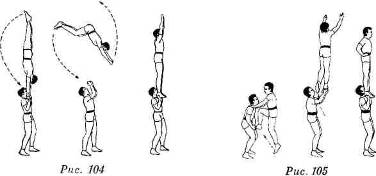 Исполнение. Нижний, держа на согнутых руках верхнего, делает темп, выбрасывает верхнего вверх над собой, подкручивая его плечами и руками справа налево (надо следить за правильным положением своих кистей). Верхний, стоя на кистях, одновременно с темпом нижнего, не изменяя первоначального положения своей стойки (рук, плеч, корпуса), отрывается от рук нижнего и при помощи подкручивания делает поворот справа налево на 180°. Нижний, выбросив верхнего, следит за его поворотом, ловит его кисти и принимает верхнего в лицевую стойку, смягчая его приход неглубоким приседанием (рис. 106).
