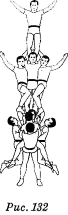 нижнего, с помощью № 11 садится верхом на ноги № 4 и держит свои прямые ноги в горизонтальном положении, прижимая их к корпусу нижнего; № 6 подходит спереди к колонне, с помощью № 10 и 11 садится верхом на ноги № 4; № 7, подойдя к колонне сзади, с помощью № 10 и 11 садится верхом на ноги № 5, придерживаясь руками за нижнего. № 10 и 11 берут за плечи № 8 и 9 и подносят их с разных сторон вплотную к колонне, № 8 и 9 плотно обхватывают руками (каждый одной рукой) спину № 2 и, переходя с плеч № 10 и 11, становятся каждый одной ногой на соответствующее плечо нижнего, ставя другую ногу, не опираясь на нее, на предплечья рук нижнего. № 10 и 11 подходят сбоку с разных сторон к нижнему, одновременно обхватывают руками его плечи и, подтянувшись на руках, сняв ноги с пола и согнув их, плавно повисают на плечах нижнего, плотно зажимая своими коленями колени нижнего (рис. 132).