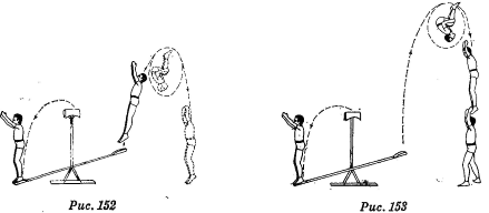 Исполнение. Отбивающий и верхний принимают нужное исходное положение, после чего верхний руками подает условный сигнал, свободный партнер также подает сигнал, отбивающий с тумбы прыгает на конец подкидной доски, с силой отбивает и дожимает подкидную доску. Верхний, немного не долетая до мертвой точки, группируется, исполняет заднее группированное сальто. Когда верхний исполнил в воздухе полсальто, т. е. когда он находится в воздухе вниз головой, он должен хорошо видеть землю; не докручивая полностью заднее сальто, он резко разгруппировывается, останавливая этим дальнейшую крутку корпуса, и докручивает сальто за счет имеющейся высоты (рис. 152).