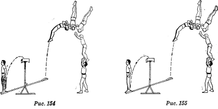 Верхний при исполнении данного сальто во время крутки не додерживает до конца свой корпус в прогнутом положении; перед приходом на плечи ловитора, докручивая сальто, он подает ему ноги движением, аналогичным движению первой половины курбета (рис. 154).