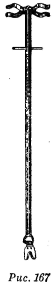 На верхний конец трубы с правой и с левой стороны накладывают пластинки; в отверстия пластинок и трубы пропускают болт; гайкой этого болта пластинки плотно прикручивают к трубе; под гайку подкладывают шайбу. На расстоянии 39 см от верхнего конца в трубе прокручивают сквозное отверстие диаметром 13 мм (по отношению к верхнему отверстию это отверстие прокручивается с правой стороны). В отверстие вбивают стальной стержень диаметром 13—15 см, длиной 29 см; концы его должны быть одинаковой длины. На этот стальной стержень средний (ловитор) становится ногами, упираясь голенями в рогатку; стальной стержень обматывают толстым слоем изоляционной ленты, иначе стержень будет скользить и резать ступни ног среднего (рис. 167).