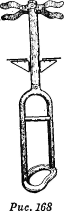 К верхнему концу выгнутой трубы посередине приваривают в вертикальном положении стальную трубку диаметром 35 мм, длиной 13 см, на эту трубку надевают трубу, на которой устроена рогатка; в этой трубке и в надетой на нее трубе имеется сквозное отверстие, в которое вставляют болт, скрепляющий ручную и верхнюю рогатку. Верхняя рогатка имеет такую же форму, как и на поясном шесте, только вместо стального стержня приваривают стальные пластинки, имеющие форму ступни двух ног; для прочности под эти пластинки к рогатке приваривают железные угольники. Общая длина ручной рогатки от плеча нижнего до верхнего конца трубы — 1 м 75 см. (рис.168).