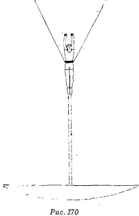 правильном положении группированного корпуса в воздухе в замедленном вращении (в крутке) исполняется заднее группированное сальто-мортале на батуте. В момент вращения акробат должен видеть потолок цирка и сетку батута и все время точно ориентировать положение своего тела в воздухе. При исполнении этого сложного упражнения акробата следует страховать в воздухе двойной лонжей (рис- 170).