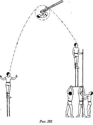 становится на ходулях на горизонтальный шест. Нижние глубоко приседают, а затем вместе с верхним выпрямляются. Верхний стоит на горизонтальном шесте боком к нижним. Продолжая держаться правой рукой за вертикальный шест, он хлопком левой ладони о свое левое бедро подает сигнал, что готов к исполнению трюка. Один из нижних партнеров в свою очередь произносит «ап». Затем нижние тройным темпом сильно и резко подбрасывают верхнего вверх-назад. В начале движения вверх акробат на шесте должен успеть послать свои плечи назад, продолжая еще держаться рукой за вертикальный шест. В момент толчка верхний отталкивается прямыми ногами от шеста, резко и сильно направляет прямые руки и плечи вверх-назад. Голова также откидывается назад. Верхний взлетает высоко вверх. Группированные ноги резко коленями прижимаются к груди. В резкой быстрой крутке исполняется заднее группированное сальто-мортале на ходулях, затем быстрая разгруппировка. Руки резко поднимаются вверх над головой (рис. 181).