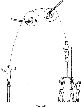 пируэт двойное сальто-мортале. Далее следует быстрая раз-группировка и приход на пол на ходули (рис. 184)