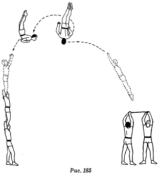 Верхний, взлетев над колонной, ставит прямые руки в кисти рук к среднему на колонну и фиксирует стойку руки в руки у среднего в колонне (рис. 186).