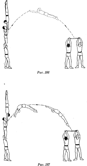 разгруппировывается. Приходит ногами в кисти рук среднего партнера. Средний мягко пассирует приход верхнего на согнутых руках, а затем отжимает верхнего на вытянутых руках, фиксируется трюк (рис. 189).
