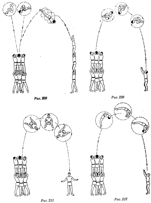 Верхний стоит на «решетке» трех колонн. Лицом он обращен к среднему партнеру третьей добавочной колонны. Средние партнеры трех колонн выбрасывают верхнего сильно и резко вверх-назад. Верхний в быстрой, резкой крутке исполняет тройной планш-сальто-мортале на пол (рис. 212).