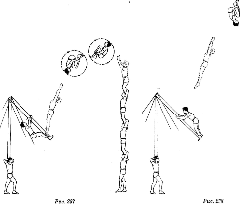 Длительно фиксируется последний трюк. Оставшийся на допинге верхний поворачивается спиной к колонне. Очень сильно раскачивается на допинге, исполняет заднее группированное сальто-мортале, приходит на плечи к среднему в колонну фирмангох (рис. 238).