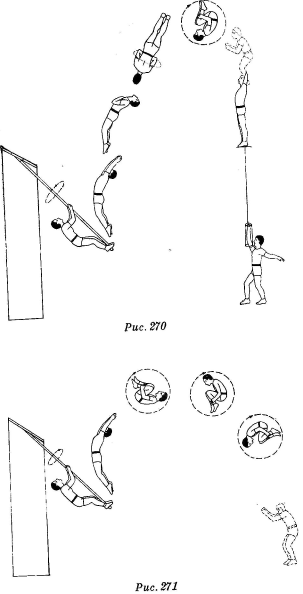 несколько полных оборотов. Три нижних берут по шесту (их длина 5 м). На первом поясном шесте стоит средний, на втором плечевом шесте и на третьем ручном шесте стоит по одному среднему. С первого шеста верхний, предварительно совершив полный оборот, исполняет тройное группированное сальто-мортале и приходит на плечи к среднему, находящемуся на поясном шесте. Второй верхний, также с полного оборота, исполняет двойное заднее группированное сальто-мортале и приходит на плечи к среднему, находящемуся на плечевом шесте. С третьего крайнего качающегося шеста с полного оборота верхний исполняет пируэт двойное сальто-мортале и приходит на 'плечи к среднему, находящемуся на ручном шесте. После фиксации трюков верхние с шестов возвращаются на качающиеся шесты (рис. 268, 269, 270).
