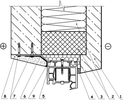 1 — стеновая железобетонная трехслойная панель; 2 — эффективный утеплитель стеновой панели; 3 — пенный утеплитель; 4 — изоляционная саморасширяющаяся паропроницаемая водоизоляционная лента; 5 — анкерная пластина; 6 — пароизоляционная лента; 7 — дюбель со стопорным шурупом; 8 — штукатурный слой внутреннего откоса (с фаской для слоя герметика); 9 — герметик