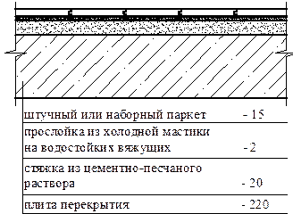 L – расстояние между лагами принимается при покрытиях из: - паркетных досок толщиной 25 мм или шпунтовых досок толщиной 28 мм – от 400 до 500 мм; - паркетных щитов – от 300 до 400 мм; - досок толщиной 21-23 мм – от 350 до 400 мм.