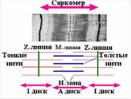 Микроскопическое изучение строения миофибрилл показало, что они состоят из чередующихся светлых и тёмных участков, или дисков, что создаёт под микроскопом видимую исчерченность всего мышечного волокна (рис. 12.2):