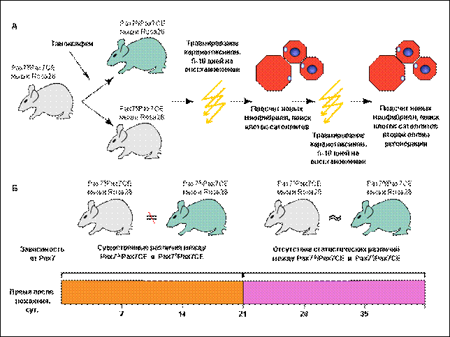 В результате оказалось, что регенерация мышечных фибрилл перестает быть зависимой от клеток-потомков Pax7+ предшественников после 21 суток постнатального развития. Именно на этом сроке развития завершается формирование «архитектурного облика» мышечного волокна, распределяются ядра, и обособляются молчащие клетки-миосателлиты