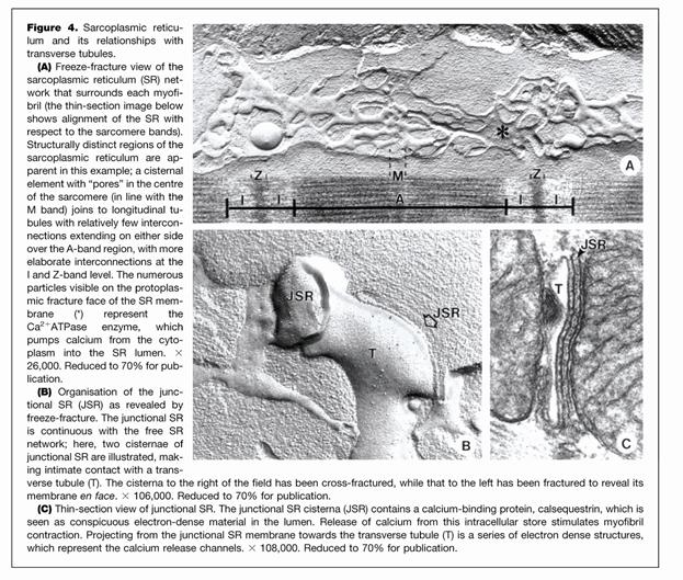 - Т-система, наоборот, развита значительно сильнее, чем в скелетной мышце. Т-каналы имеют средний диаметр в 150-200 мкм (против 40 мкм в скелетных мышцах) и имеют вид широких разветвленных каналов, входящих в кардиомиоцит на уровне z – дисков. Полагают, что по Т-системе в сердце распространяется не только импульс, но и поступают в клетку метаболиты.