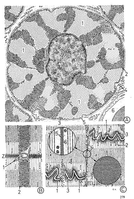 - сильное развитие митохондрий особого «цепочечного типа». Отдельные митохондрии располагаются между миофибриллами,образуя длинные цепочки. Каждая митохондрия соединена в соседней с помощью специализированного межмитохондриального контакта (ММК).Они образуют единую энергетическую систему миоцита и есть в сердечной ткани всех позвоночных, а также у моллюсков и насекомых. Кроме выше описанных т.н. «цепочечных, межфибриллярных»митохондрий, в миоцитах есть еще две субпопуляции митохондрий: субсарколеммальная – группы митохондрий, расположенных в местах прилежания капилляров и околоядерная - группы митохондрий концентрирующиеся в ядерной области. Во всех субпопуляциях между митохондриями есть ММК.