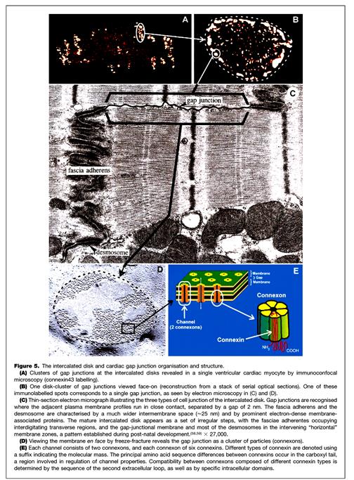 Не все коннексины одинаковые – однаружено до 16 генов, которые контролируют экспрессию разных видов коннексинов ( коннексин-43, 40,45). Разные коннексины обнаружены в составе контактов в разных участках миокарда, по-видимому определяя какие-то функциональные различия этих участков миокарда. Располагаются они вдоль длинной оси миоцитов, тогда как десмосомы и промежуточные соединения (зоны слияния) поперек, и обладают низким электрическим сопротивлением.