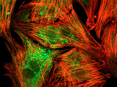 Рис. 4.1.10. Иммуноцитохимия кардиомиоцитов (в культуре). Красным обозначены фибриллы актинового цитскелета, зеленым – бактериальная инфекция (эндотоксины) при сепсисе.