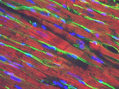 Рис. 4.1.11 Иммуногистохимия кардиомиоцитов. Красный цвет – а-актинин, зеленый – кровеносные сосуды, голубой – ядра кардиомиоцитов и других клеток.