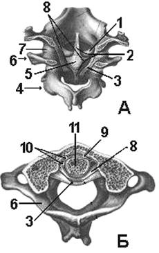 б) задней продольной связки, lig. longitudinale posterius, которая начинается от задней поверхности тела II шейного позвонка, проходит внутри позвоночного канала по задней поверхности тел позвонков, прикрепляясь к ним и к межпозвоночным дискам, и заканчивается на телах крестцовых позвонков.