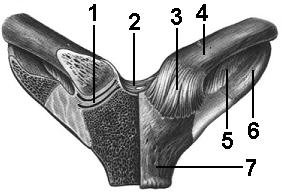 2. Дуги позвонков соединяются между собой посредством желтых связок, ligg. flava (рис.11). Эти связки очень прочные, эластичные, имеют желтоватый цвет, заполняют промежутки между дугами.