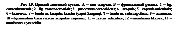 Плечевой сустав, art. humeri. В нем происходит сочленение свободной верхней конечности с ее поясом (рис.19) посредством соединения поверхности суставной впадины лопатки и головки плечевой кости. Конгруэнтность суставной впадины лопатки увеличивается за счет суставной губы, labrum glenoidale, которая прикрепляется по краям впадины.